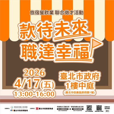 臺北就業服務處4/17(五)下午1-4時在臺北市政府1樓中庭舉辦「款待未來‧職達幸福」旅宿餐飲業聯合徵才活動,請上網搜尋臺北市就業服務處官網或電洽(02)2308-5231。