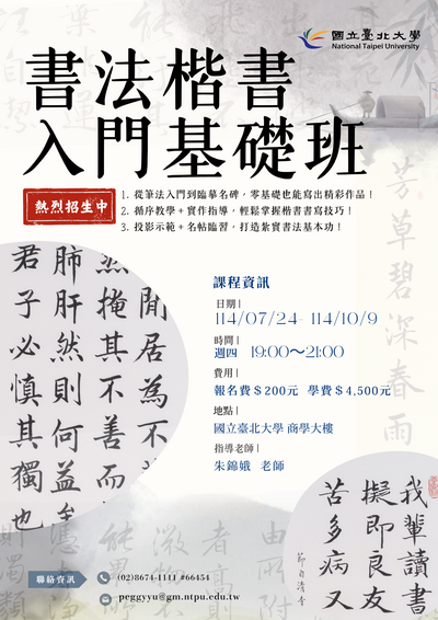 一、適合零基礎對書法有興趣之成人、學生,循序漸進教學,從握筆到筆畫,完整學習「永字八法」,老師帶您一步步掌握書法。