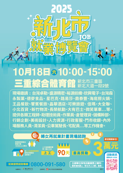 新北市政府就業服務處於10月18日(星期六)上午10點至下午3點在三重綜合體育館,舉辦「2025新北市就業博覽會」,邀請70家廠商,提供超過4,000個工作機會,歡迎求職者踴躍參加。
