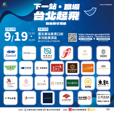 臺北市就業服務處9月19日(五)13時至16時在臺北車站1樓大廳,舉辦「下一站職場‧台北起飛-徵才活動」,現場面試、提供814個工作機會,詳情搜尋台北就業大補帖網站或電洽(02)2308-5231。