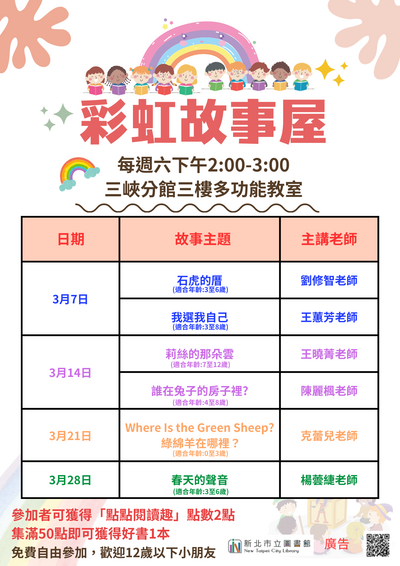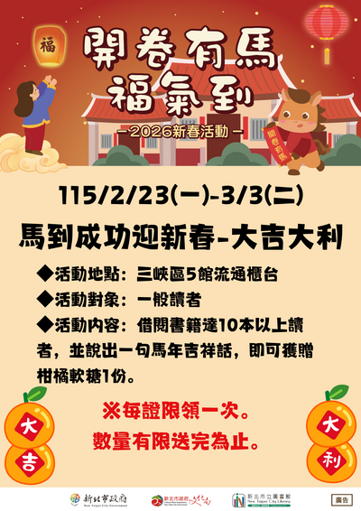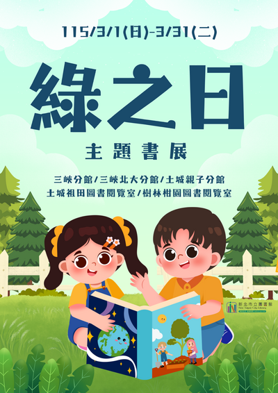 新北市立圖書館本館三峽、三峽北大、土城親子分館及土城祖田、樹林柑園圖書閱覽室115年3月份閱讀推廣活動